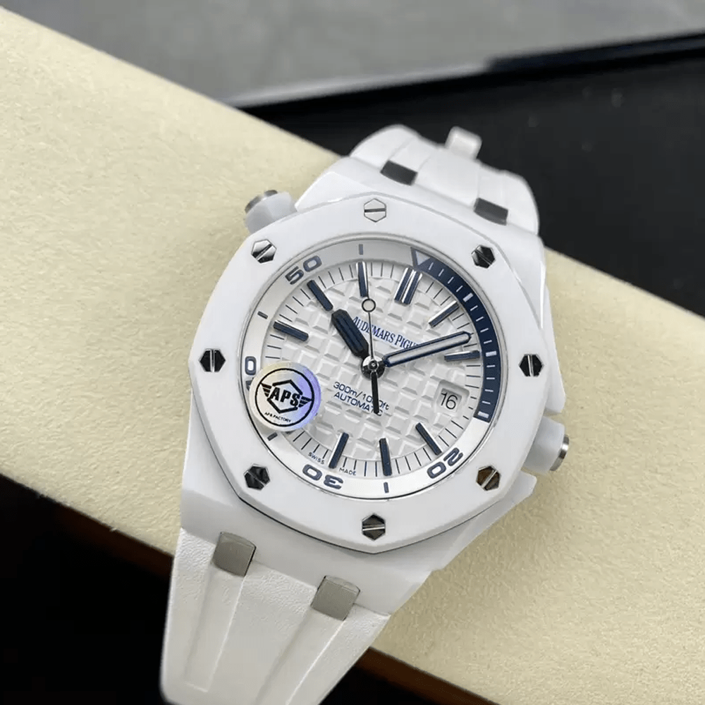 APS 공장 오데마피게 로얄오크 오프쇼어 다이버 화이트 다이얼 세라믹 베젤 화이트 러버 스트랩 42mm 15707
