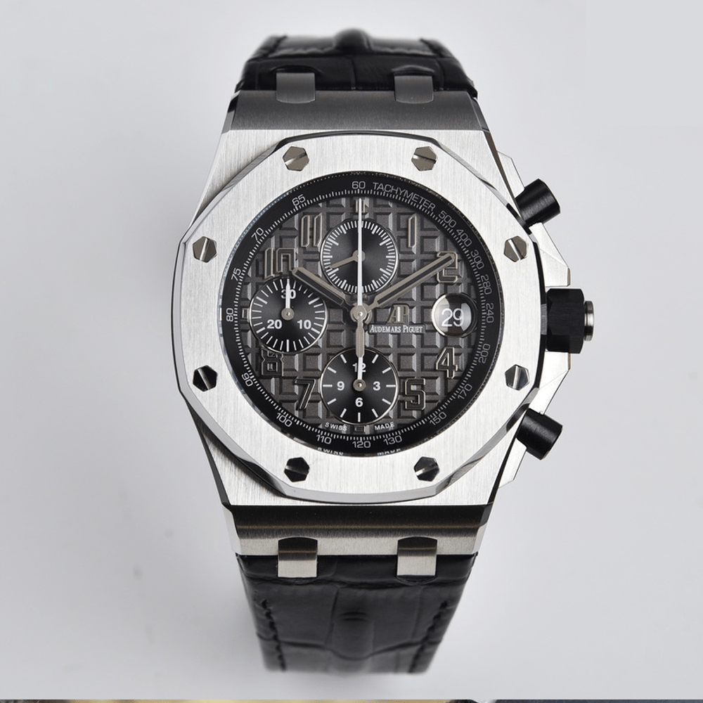 오데마피게 로얄오크 오프쇼어 다이버 크로노그래프 그레이 다이얼 블랙 가죽 스트랩 42mm 26470ST