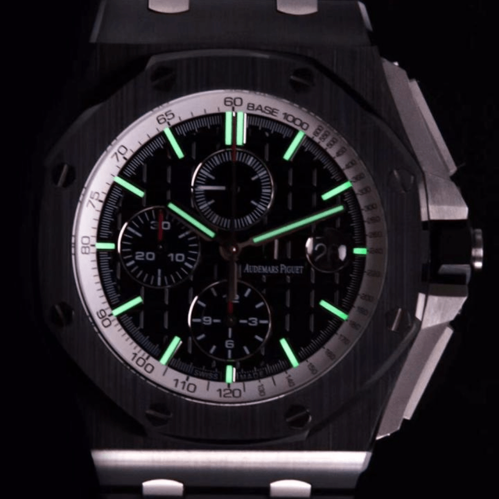 4. 다이얼은 오데마 피게의 클래식한 대형 격자무늬를 배경으로 선명한 그리드 배열을 적용했으며, 완벽한 폴리싱 과정을 거쳐 장인의 장인 정신을 온전히 반영합니다.