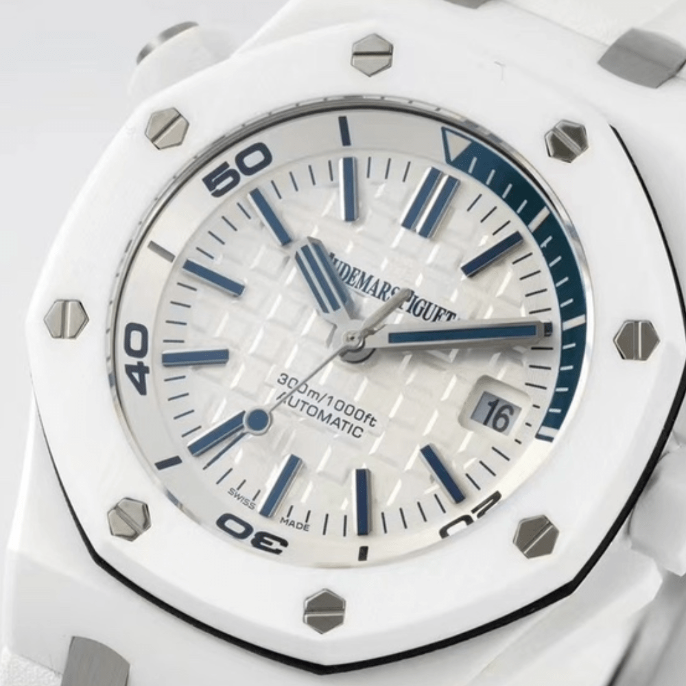 오데마피게 로얄오크 오프쇼어 다이버 화이트 다이얼 세라믹 베젤 화이트 러버 스트랩 42mm 15707CB