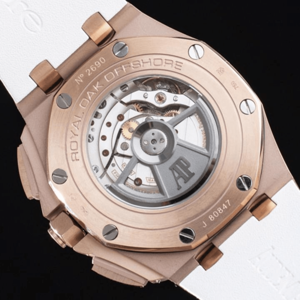 오데마피게 로얄오크 오프쇼어 크로노그래프 화이트 다이얼 로즈골드 화이트 러버스트랩 44mm 26408OR