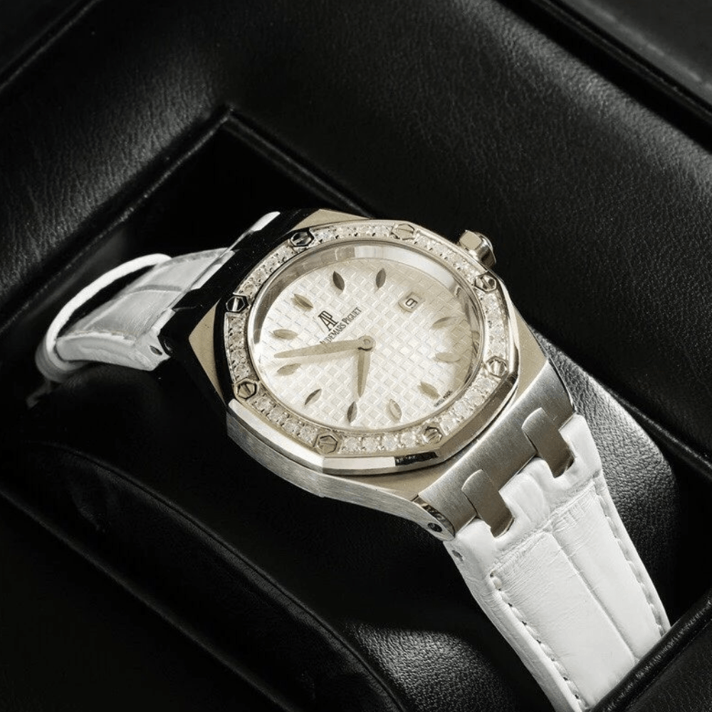 오데마피게 레이디 로얄오크 화이트 텍스처 다이얼 다이아베젤 악어가죽 스트랩 33mm 67601ST