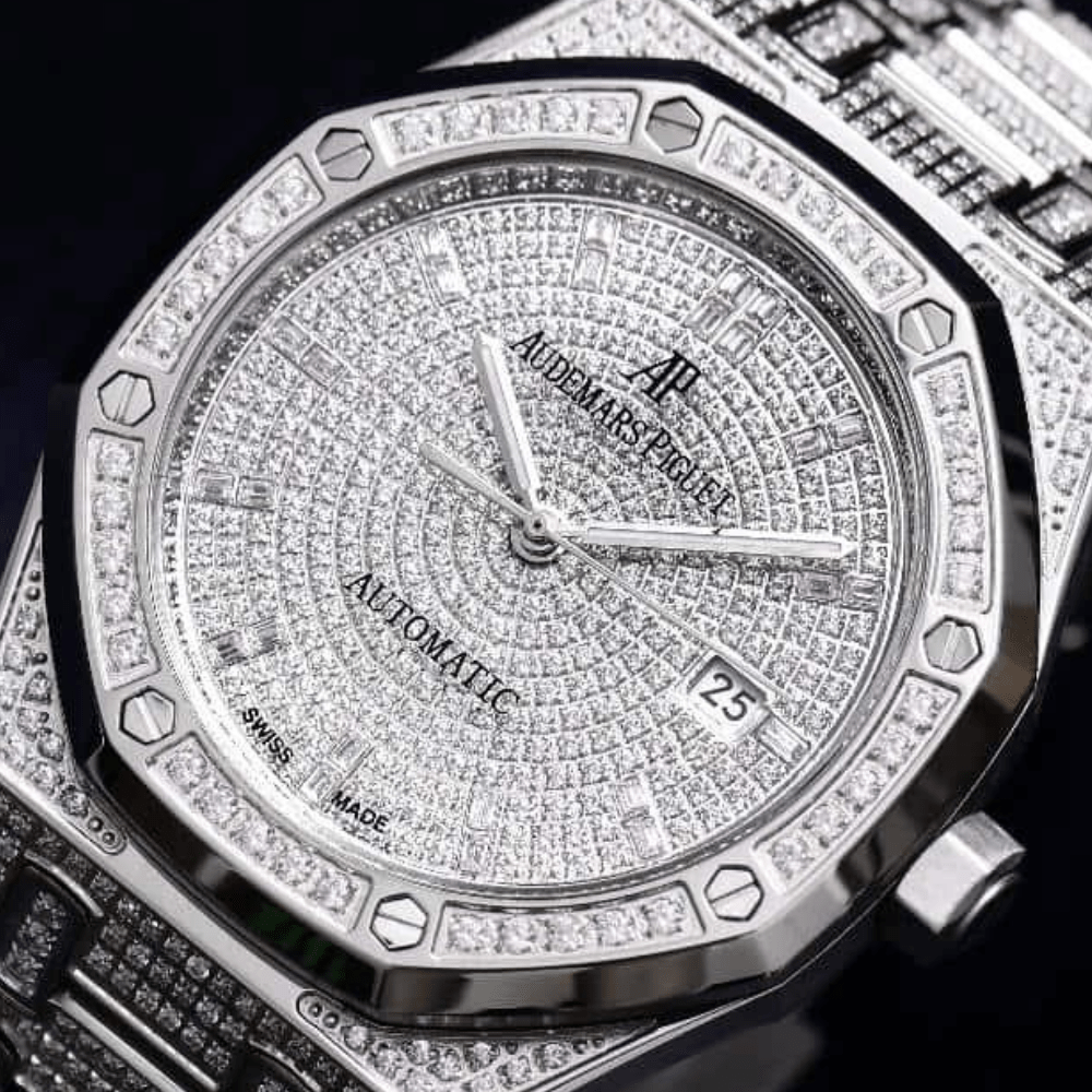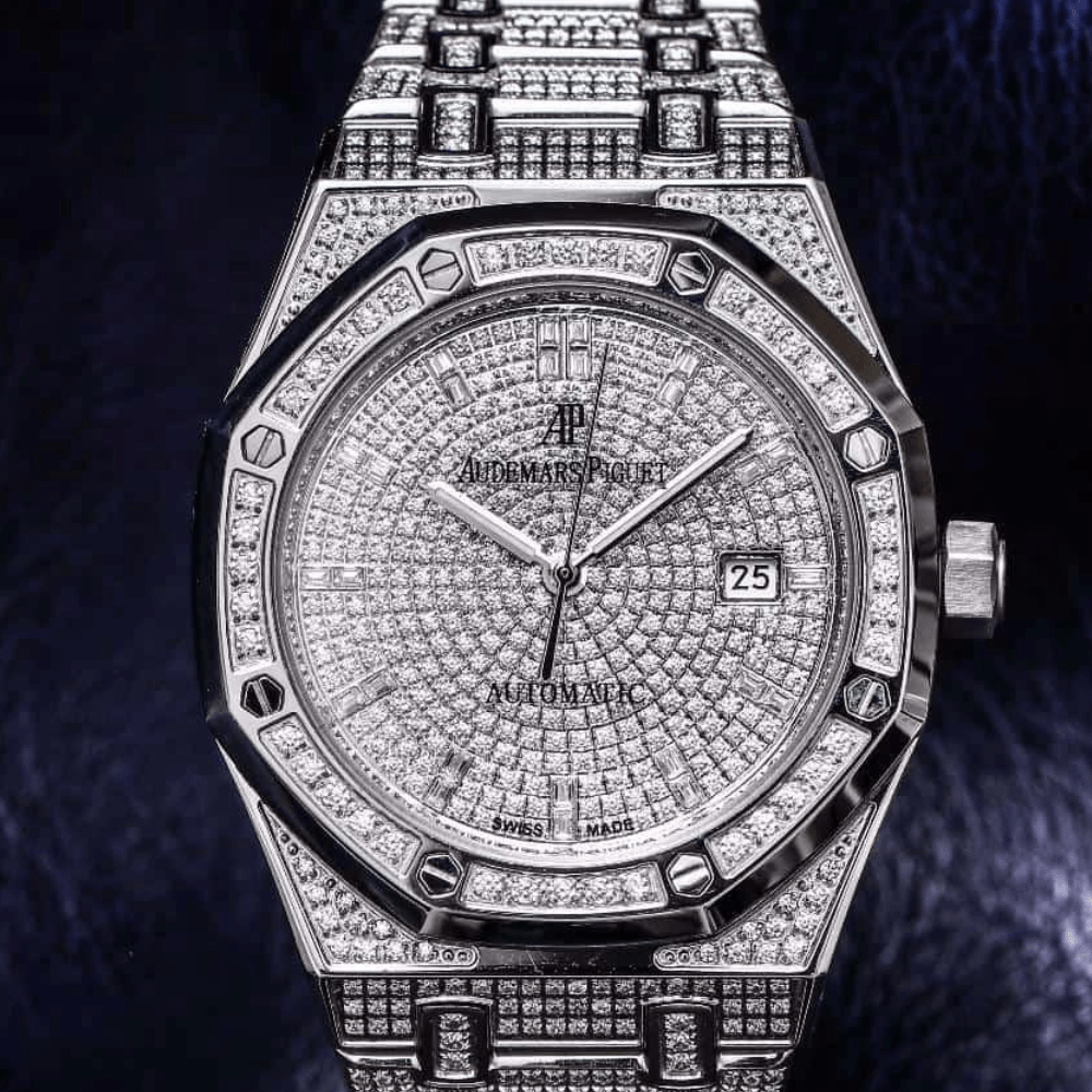 AP 오데마 피게 로얄 오크 시리즈 15452 남성용 풀 스타 다이아몬드 시계는 1,000개 이상의 모이사나이트(가장 단단하고 특별한 다이아몬드)를 수작업으로 세팅하여 제작되었으며, 오리지널 3120 오토매틱 기계식 무브먼트를 개선한 수입산 9015 무브먼트를 탑재했습니다. 안정적인 작동 시간과 긴 수명을 자랑합니다. 남성용 4 사이즈는 1mm X 10mm(여성용 37mm는 개발 중)이며, 긁힘 방지 사파이어 스톤 미러 페이스는 품격과 부의 상징입니다.