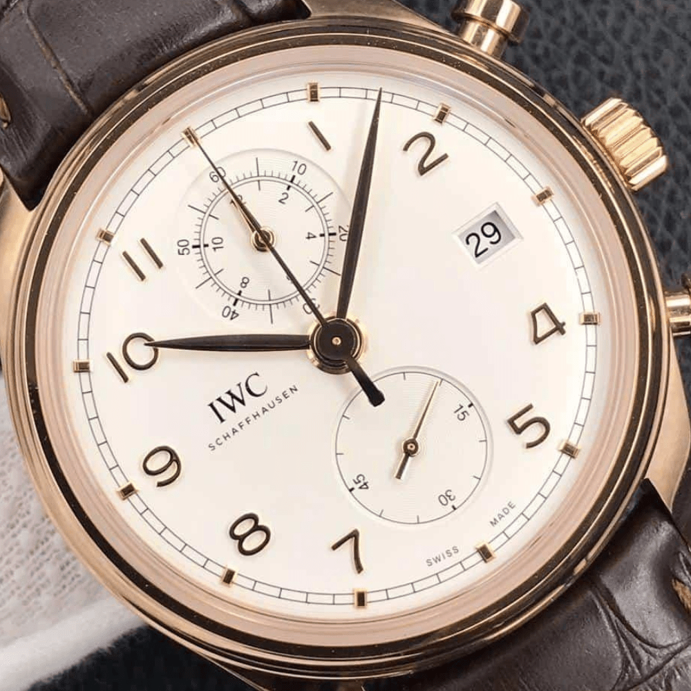 IWC 포르투기저 크로노그래프 클래식 로즈골드 화이트 다이얼 레더 스트랩 42mm IW390301