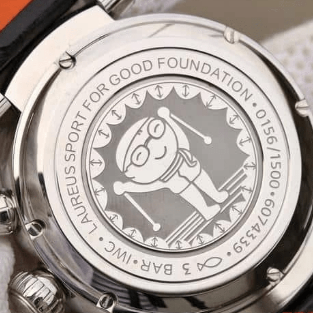 시계 뒷면에는 "라우레우스 스포츠 재단"이라는 문구와 수상 경력에 빛나는 어린이 그림이 새겨져 있으며, 동아시아 스페셜 올림픽 스키 경기에 참가한 어린 소년의 자화상이 그려져 있습니다.