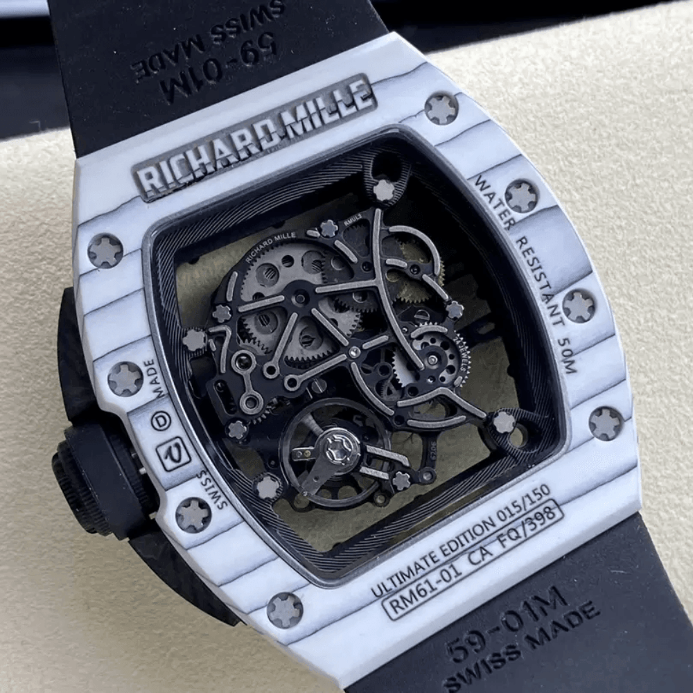 ▶ ️RM61-01 "Ultimate Edition" 시계에는 약 55시간의 동력을 제공하는 RMul2 중공 수동 체인 무브먼트가 탑재되었습니다.