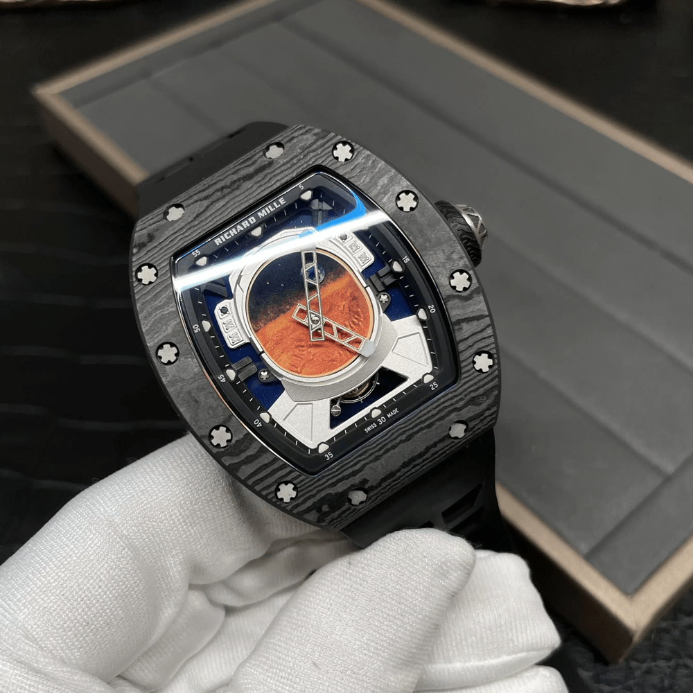 RM 52-05 투르비용 시계는 우주 비행사 헬멧과 우주 디자인의 완벽한 조화를 이룹니다. 우주 비행사 헬멧 양쪽에는 프로젝터와 카메라가 장착되어 있으며, 각 카메라에는 두 개의 다이아몬드와 블랙 커런덤이 상감되어 있습니다. 헬멧 앞면에는 명나라 시대의 불 에나멜로 장식된 가상의 불꽃별이 그려져 있습니다.
