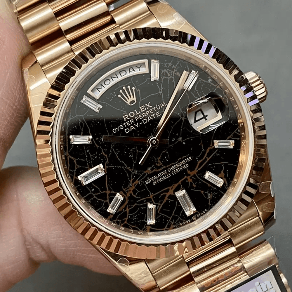 QF공장 롤렉스 데이데이트 검판 아이젠키젤 다이얼 바게트다이아 RG 금통 40mm V5(텅스텐 헤비 버전) 228235