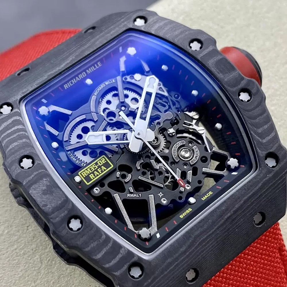 리차드 밀 RM035 RM35-02 RM3502 블랙 카본 T+ 팩토리 베스트 에디션 스켈레톤 다이얼, 레드 우븐 스트랩, 복제품 RMUL3