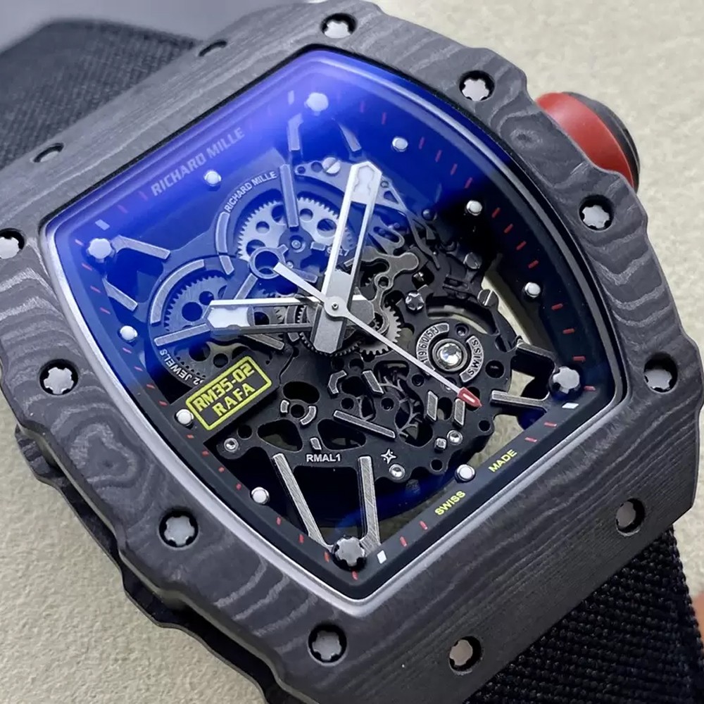 리차드 밀 RM035 RM35-02 RM3502 블랙 카본 T+ 팩토리 베스트 에디션 스켈레톤 다이얼, 블랙 우븐 스트랩, 복제품 RMUL3